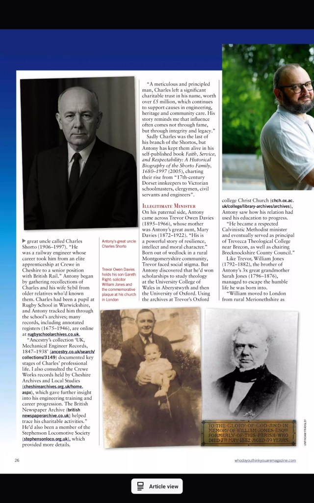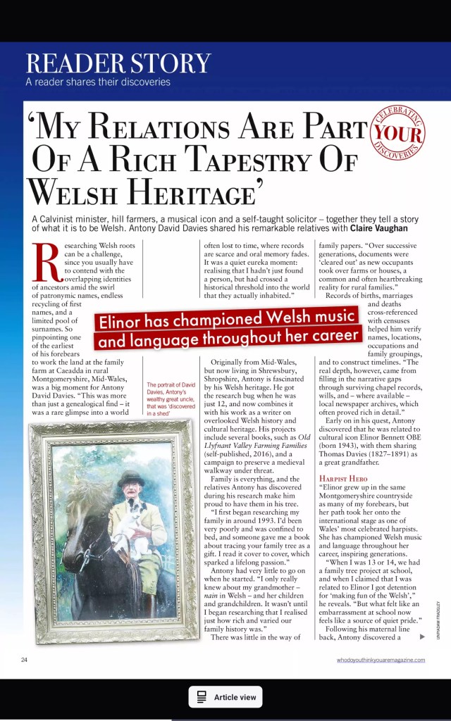 I’m delighted to share that my family history research has been featured in the latest issue of Who Do You Think You Are? magazine. The article, written by Claire Vaughan, explores my decades-long journey tracing my Welsh roots — from hill farmers and Calvinist ministers to a musical icon and a self-taught solicitor — all part of a rich and varied tapestry of Welsh heritage.